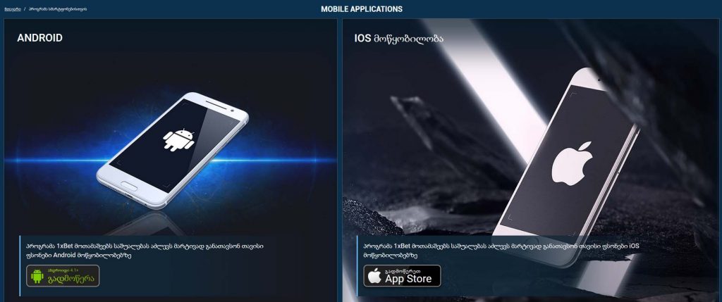 ჩამოტვირთეთ 1XBET ტოტალიზატორის მობილური აპლიკაცია, თქვენი მობილური მოწყობილობის სისტემის შესაბამისად და დაიწყეთ ფსონის განთავსება სწრაფად და მარტივად.