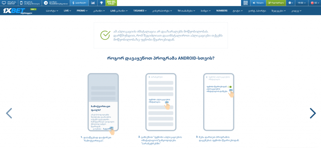 1XBET-ის მობილური აპლიკაციის ჩამოტვირთვის ამ მეთოდის ამორჩევისას, მოთამაშემ უნდა: