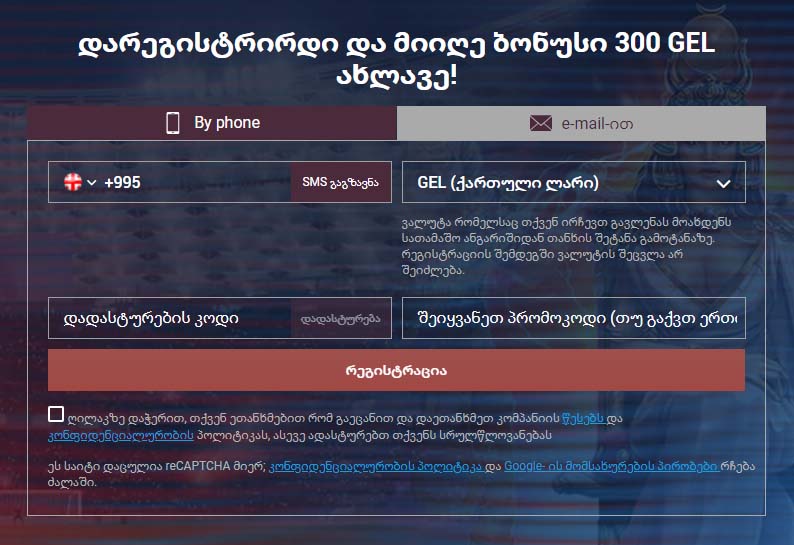 ტელეფონის ნომრით რეგისტრაციისას, მოთამაშემ უნდა მიუთითოს მისი ტელეფონის ნომერი, ამოირჩიოს სასურველი სათამაშო ვალუტა და შეიყვანოს დამადასტურებელი კოდი, რომელიც მას მიუვა მითითებულ ტელეფონის ნომერზე. პრომოკოდის არსებობისას, შეიყვანეთ სიტყვა შესაბამის ველში და დააჭირეთ ღილაკს “დარეგისტრირება”.