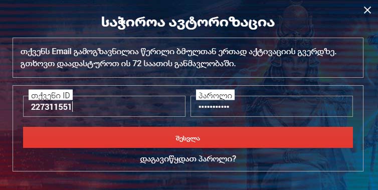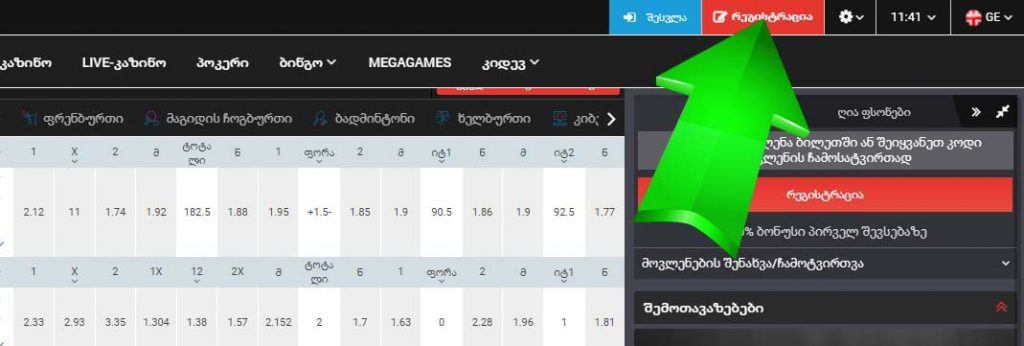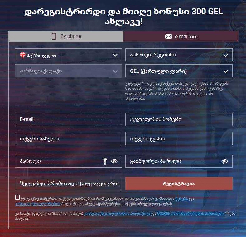 დარეგისტრირდი ვებ-გვერდზე და მიიღე 100%% ბონუსი თანხით 300 GEL-მდე (ან მისი ექვივალენტი სხვა ვალუტაში) პირველ შევსებაზე!