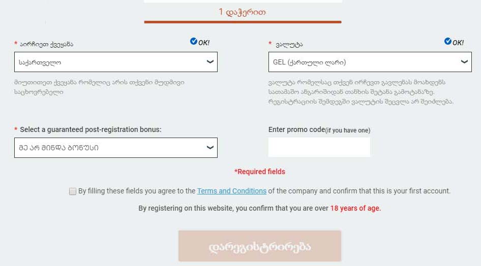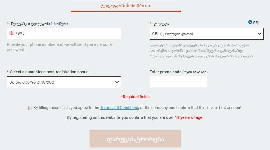 მოთამაშემ უნდა შეიყვანოს ტელეფონის ნომერი, სასურველი სათამაშო ვალუტა და ამოირჩიოს ბონუსი.