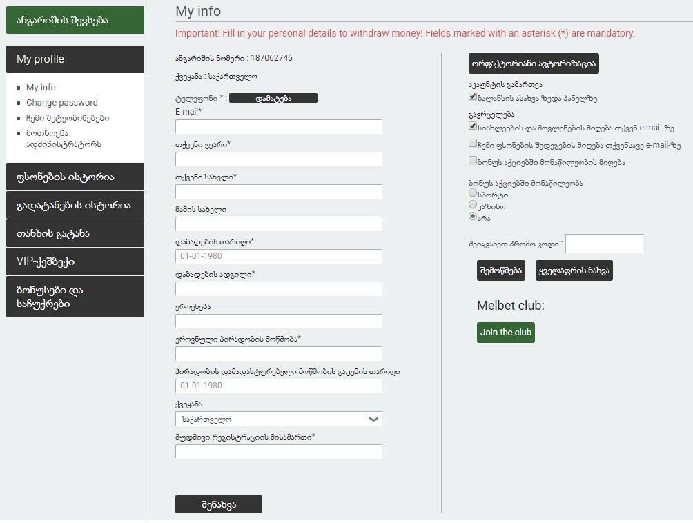 თუ მოთამაშეს სურს, რომ მომავალში სწრაფად და მარტივად გაიტანოს მოგებული თანხები, მას აუცილებლად უნდა ქონდეს შევსებული ყველა საჭირო პირადი მონაცემები. ამისთვის, მოთამაშე უნდა შევიდეს თავის პირად კაბინეტში და პირადი მონაცემების კატეგორიაში შეავსოს ყველა სავალდებულო ველი. ნებისმიერ მოთამაშეს შეუძლია დარწმუნებული იყოს იმაში, რომ Melbet-ის ადმინისტრაციის მხრიდან, რომელიც ზრუნავს თავისი მომხმარებლის უსაფრთხოებაზე და კომფორტზე, დაცული იქნება თითოეული მოთამაშეს მონაცემების კონფიდენციალურობა, კანონმდებლობის და მისი წესების და პირობების თანახმად.